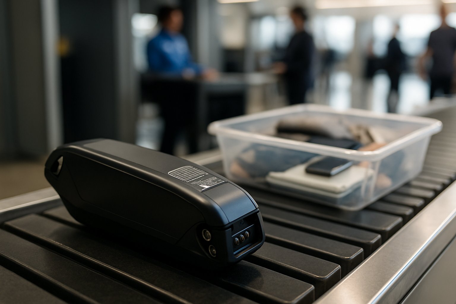 An electric bike battery on an airport security conveyor belt with other personal items and blurred travelers in the background.