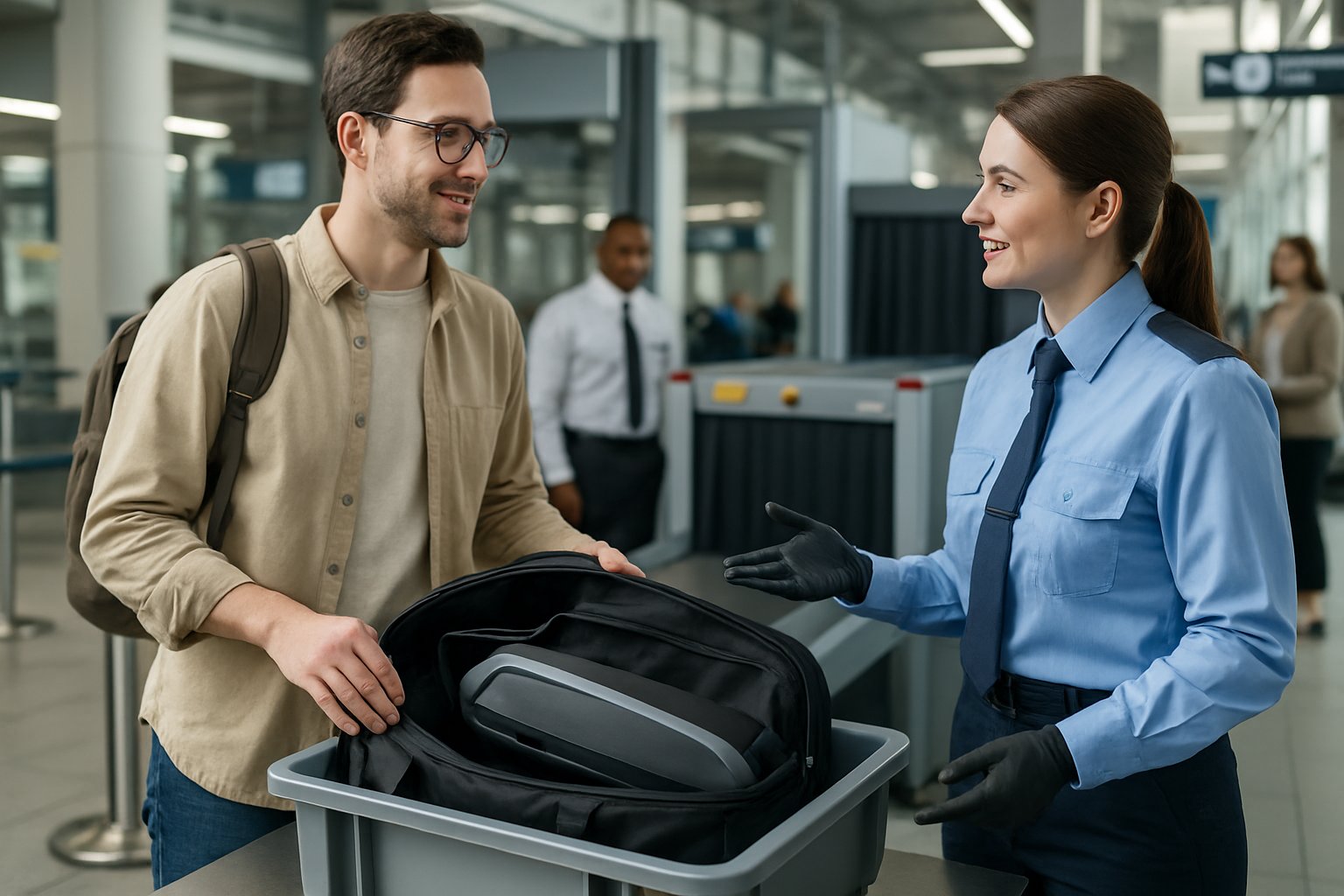 A traveler at an airport security checkpoint with an e-bike battery packed in their carry-on bag, interacting with security staff.