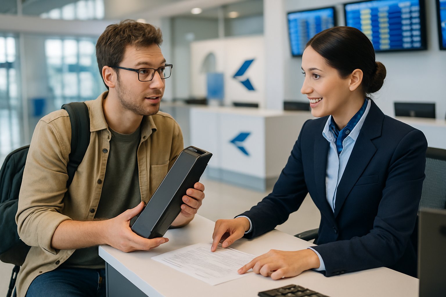 A traveler at an airport customer service desk showing an e-bike battery to an airline representative while discussing policies.