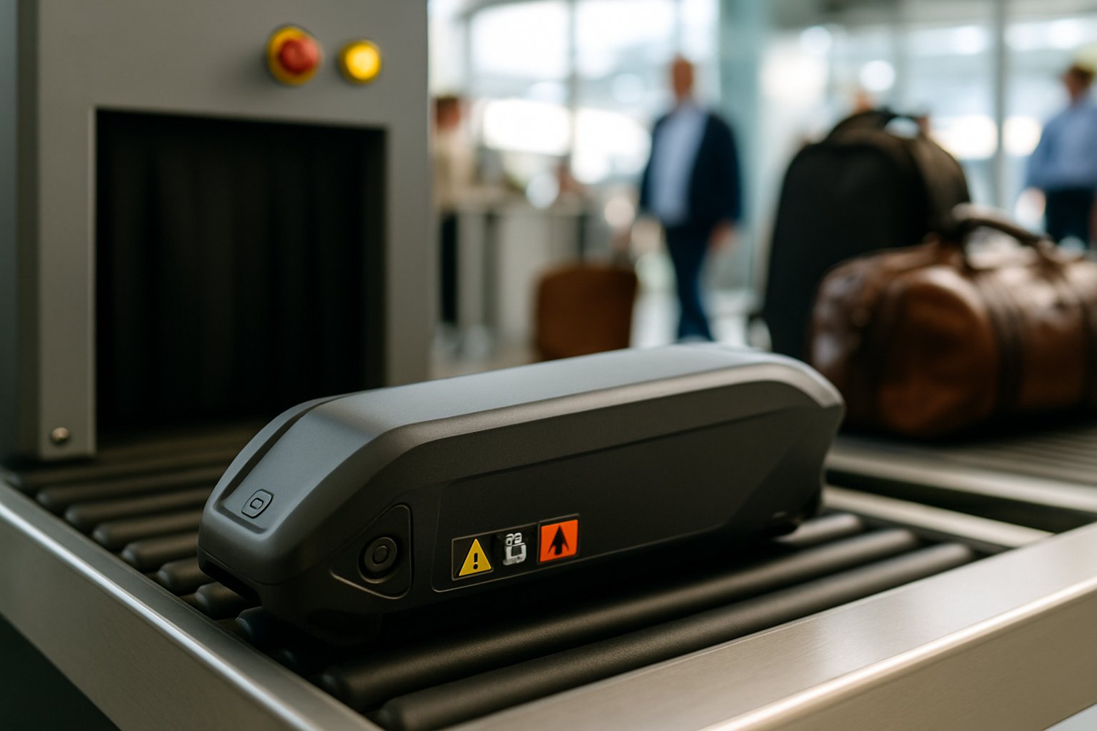 An electric bike battery on an airport conveyor belt near a security scanner with travelers in the background.
